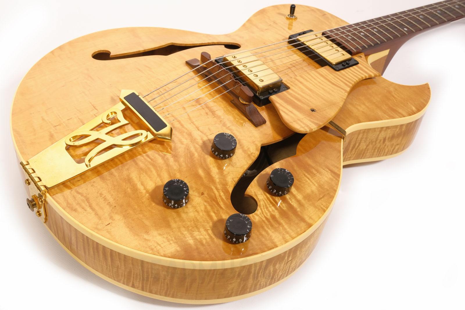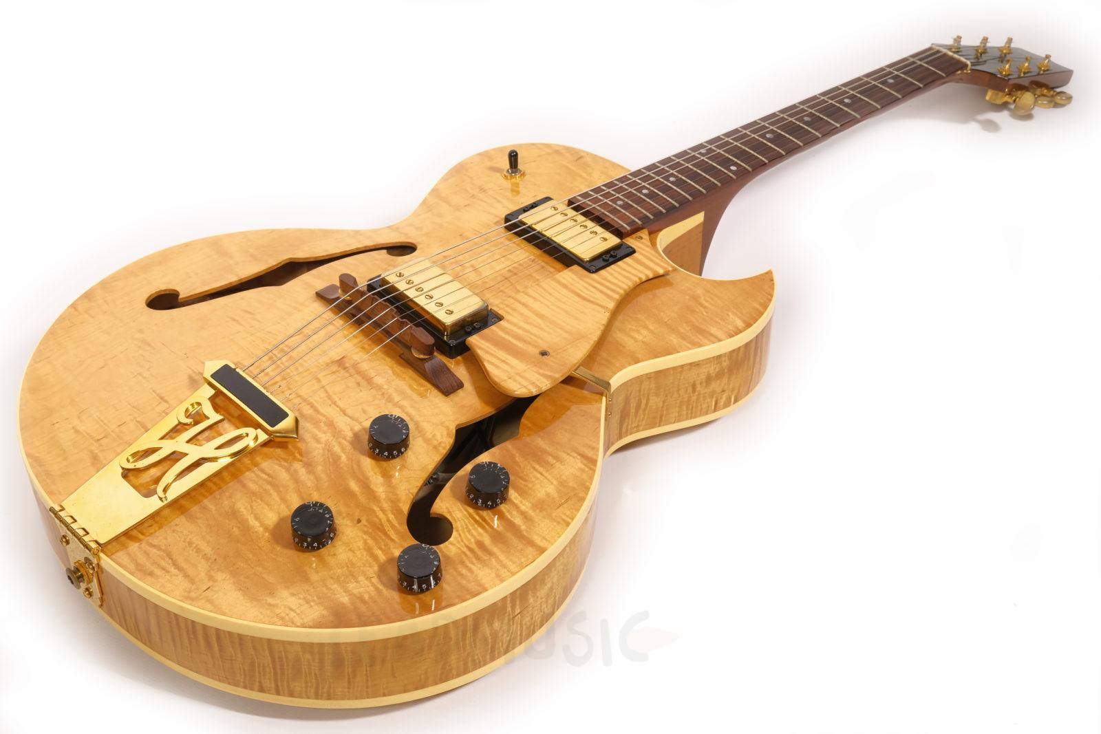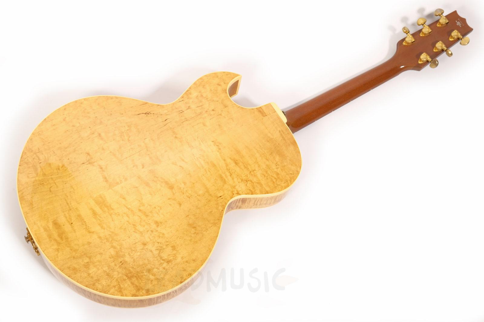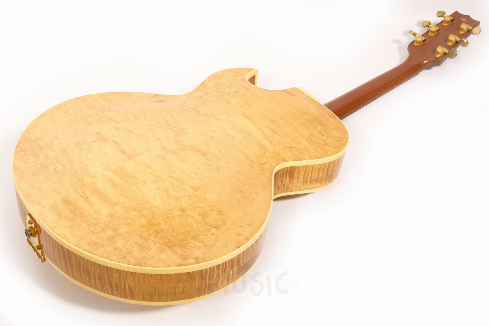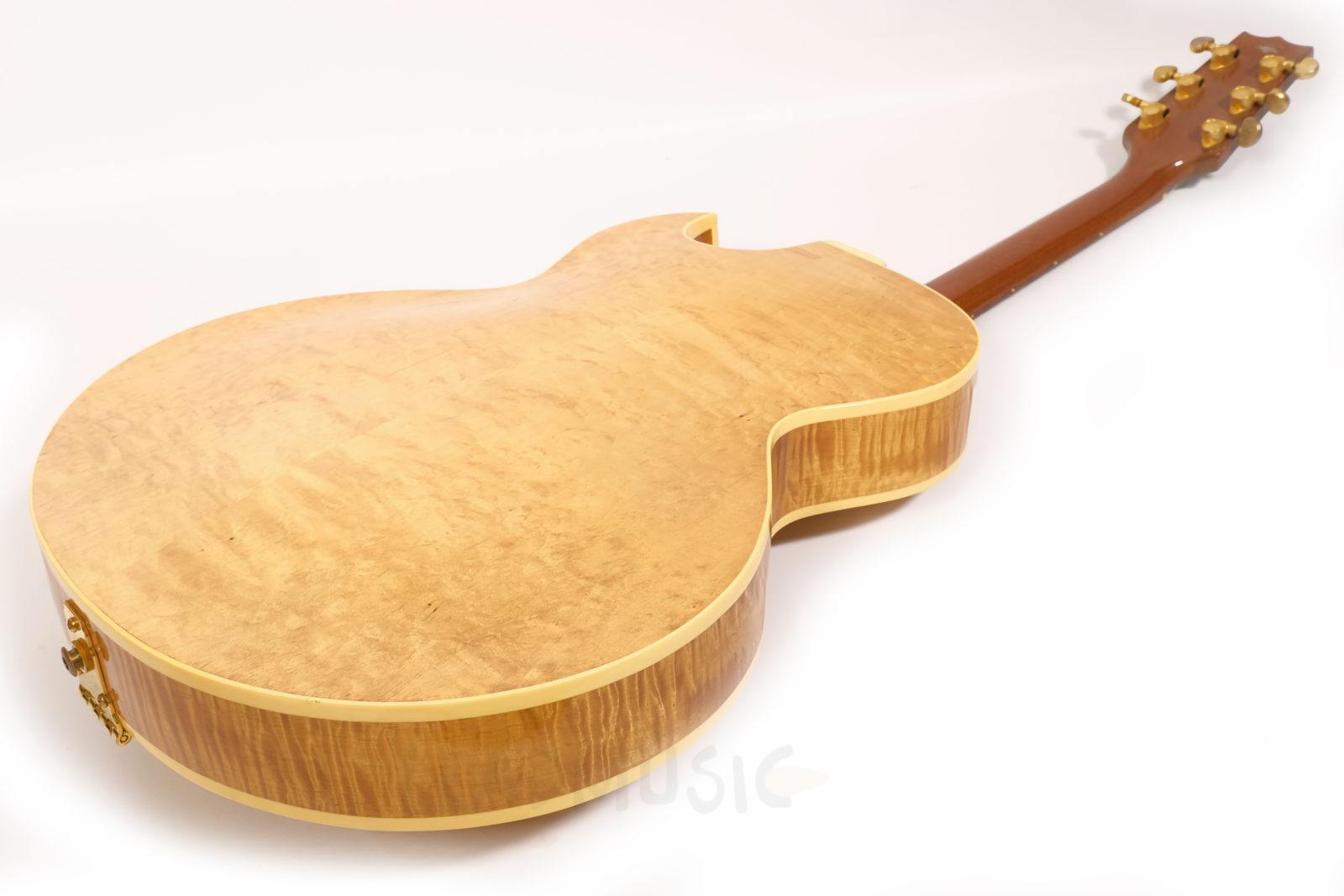 Dieses Exemplar der H575 kommt mit einer besonders stark geflammten Decke, goldener Hardware und einem wunderschönen Antique Natural Finish. Der Zustand ist sehr gut bis exzellent – offensichtlich kaum gespielt von den Vorbesitzern und zuletzt wohl eher gesammelt als regelmäßig gespielt. Leichte Spielspuren und kleine Kratzer hier und da, aber keine Lackabplatzer. Die Bünde wurden nachpoliert und zeigen nur minimale Gebrauchsspuren.