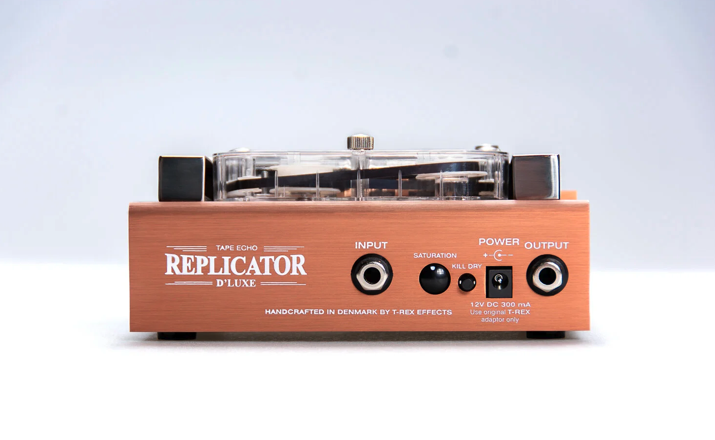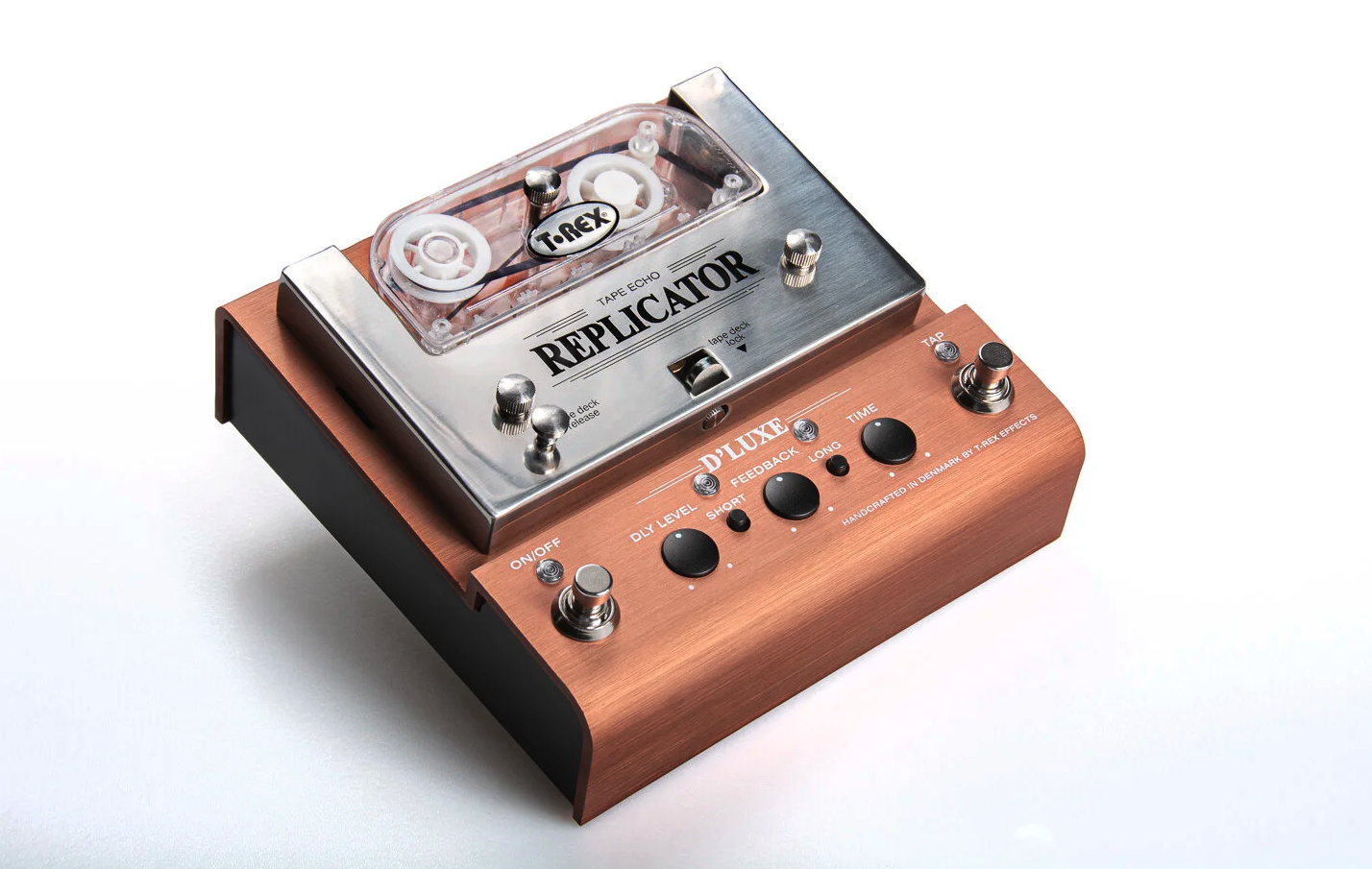 Wie seine berühmten Vorfahren, das Boss RE-201 und das Maestro Echoplex, arbeitet der Replicator D’Luxe mit einem Magnetband, das an Aufnahme- und Wiedergabeköpfen vorbeiläuft. T-Rex setzt dabei auf ein kompakteres Bandformat, das in einer Kunststoffkassette aufgespult ist. Diese moderne Version des Bandechos verfügt über einen neuen Motor, der einen besonders leisen Betrieb gewährleistet.
