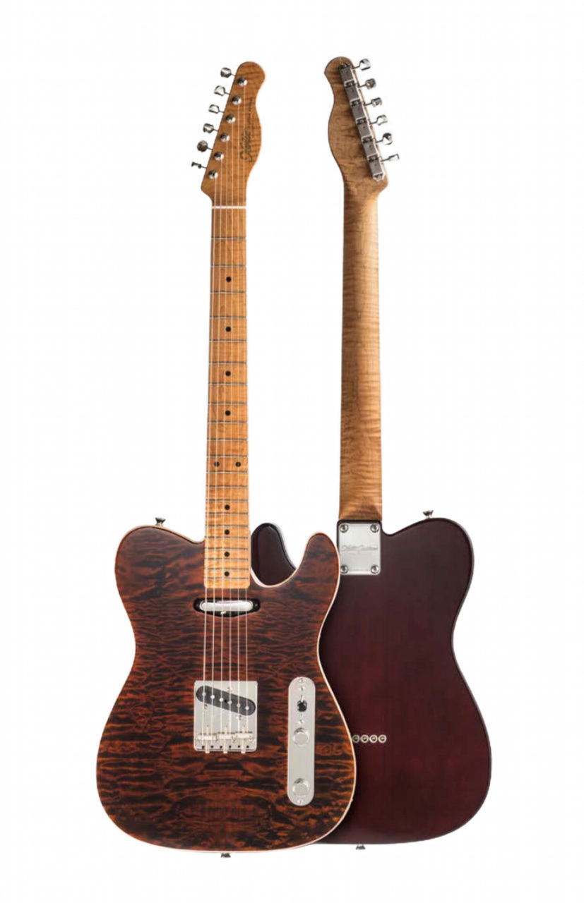 Die Xotic Xotique XTC-1 Custom ist eine absolut beeindruckende Gitarre, ausgestattet mit hervorragenden Hölzern und einer Fertigungsqualität, die – man muss es wiederholen – viele Mitbewerber klar in den Schatten stellt. Bestückt mit den besten sorgfältig ausgewählten Hölzern, repräsentiert diese einzigartige XTC-1 aus dem kleinen amerikanischen Xotique-Atelier das absolute Top-Segment der Marke Xotic, inklusive aller verfügbaren Optionen. Die Gitarre besitzt die klassische Telecaster-Form, verfügt jedoch über einen extrem leichten Erlenkorpus mit einer absolut spektakulären Quilted-Maple-Decke. Der Korpus ist in einem großartigen Espresso Royale Finish gehalten (oder schlichtweg wunderschön – je nach Geschmack) und kommt im New Old Stock Finish, also ohne Aging. Die Nitrocellulose-Lackierung bringt die gesamte wilde Maserung der optionalen 5A Quilted Maple Decke perfekt zur Geltung.