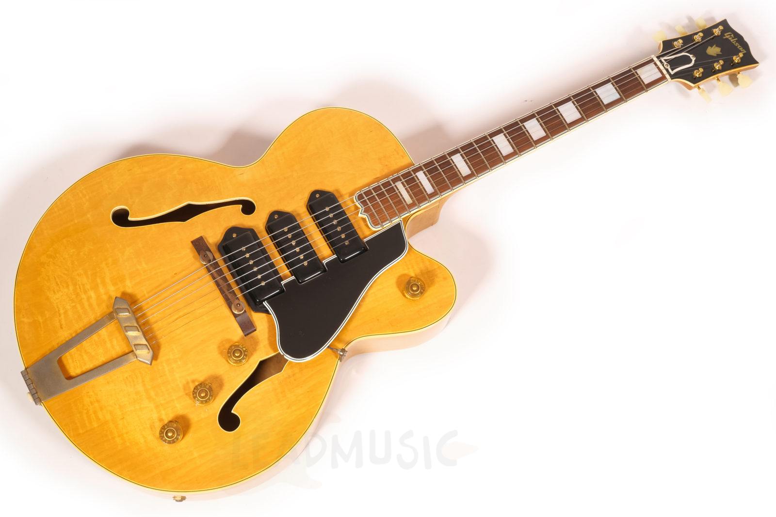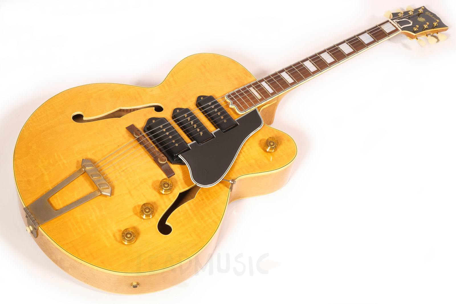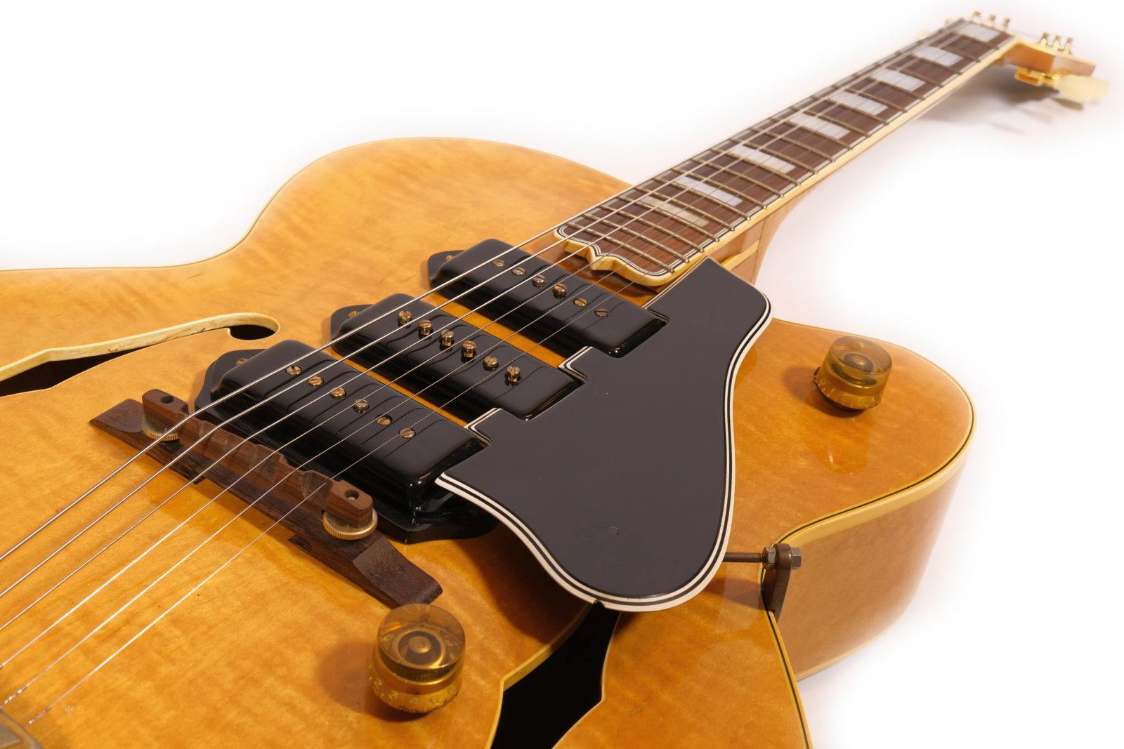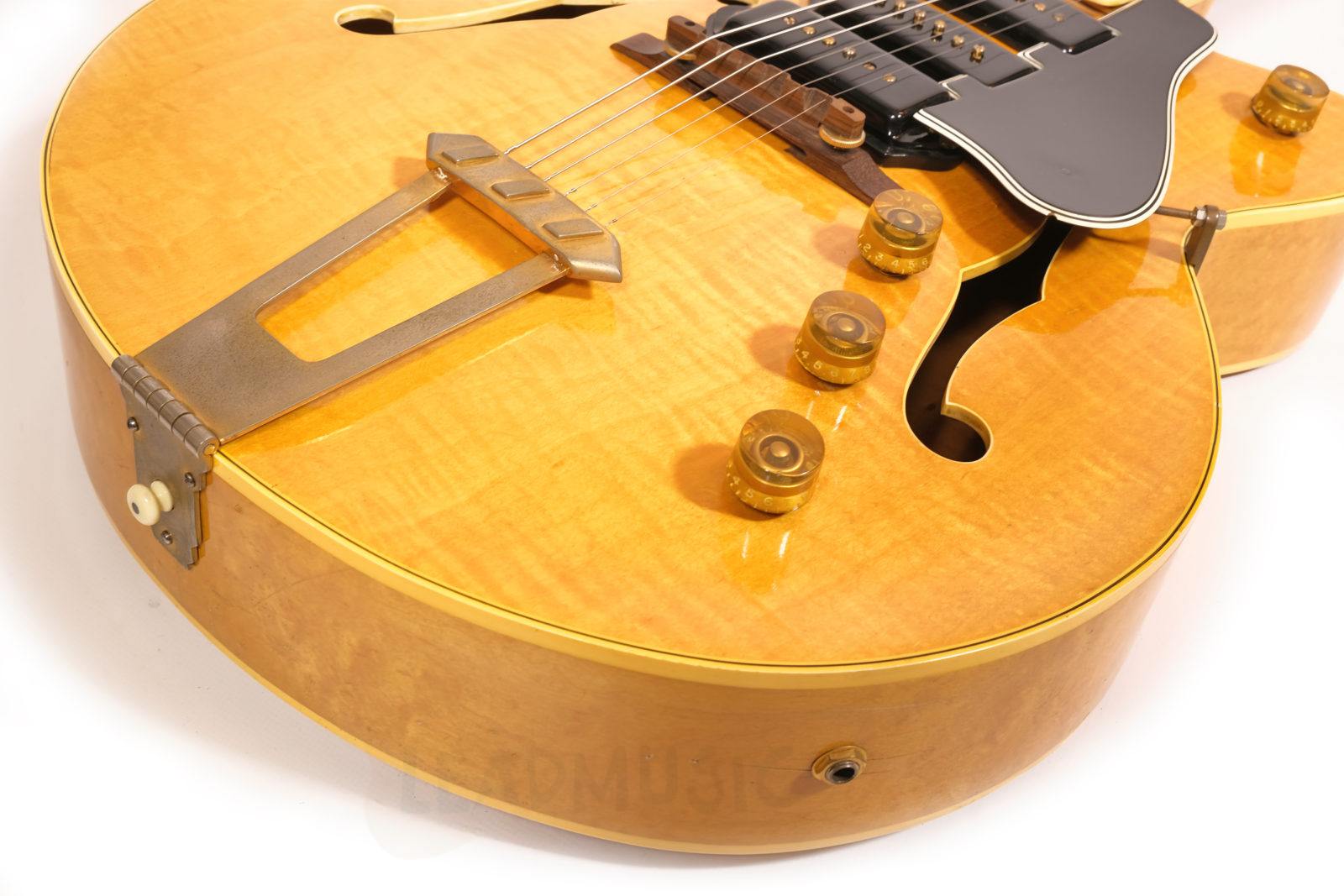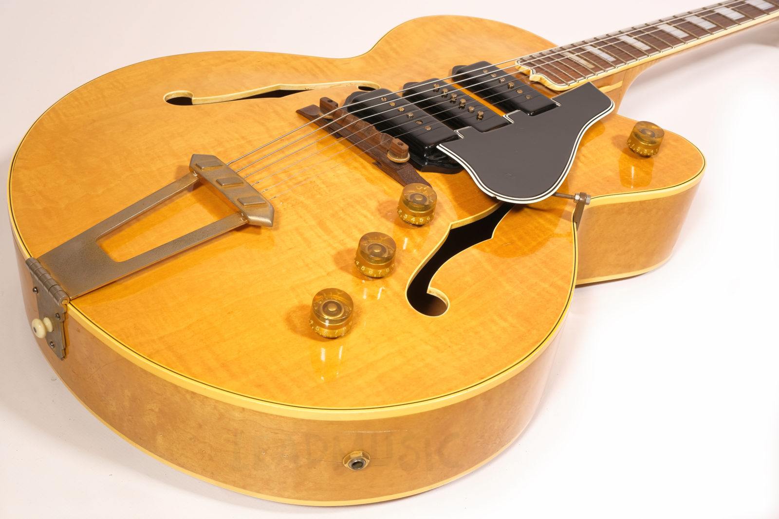 Introduite en 1949, la ES-5 possède un pont et base en palissandre et est dotée de micros P90. Contrairement aux ES-175, le corps en érable laminé est fait à partir d’érable figuré. Les flammes et motifs de l’érable de notre guitare sont superbes, assez profonds et très réguliers. Le finish gold du hardware n’a que peu été altéré et reste parfaitement doré. Le tailpiece et les mécaniques sont en parfait état de fonctionnement. L’électronique, originale à l’exception de ce potare de 1979 sur le pickup middle, ainsi que les micros P90, sont en parfait état, et les pickups, ni microphoniques ni faibles, délivrent un timbre et un équilibre parfaits. Le niveau de sortie est excellent et le tout sonne comme on l’imagine, très ample, rond, mais avec cette accentuation medium très boisée. C’est Jazz dans le timbre, certes, mais cet instrument est connu pour avoir été utilisé par des musiciens très disparates et éclectiques, et la ES-5 convient tant au Jazz qu’au Rockabilly ou encore au Rock.