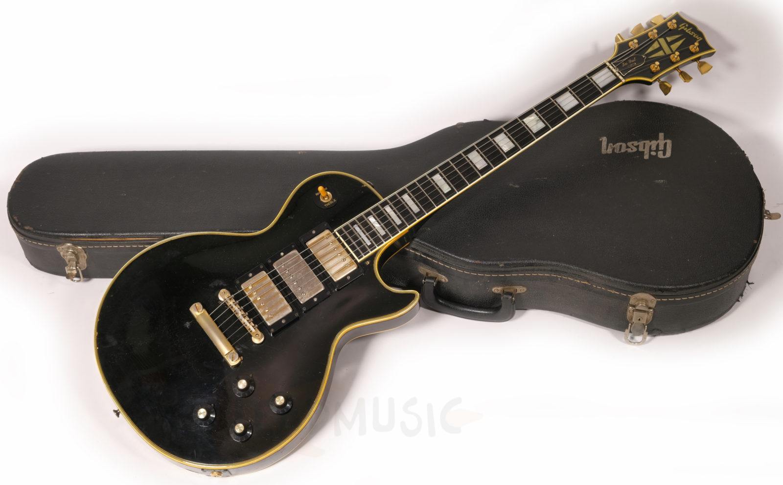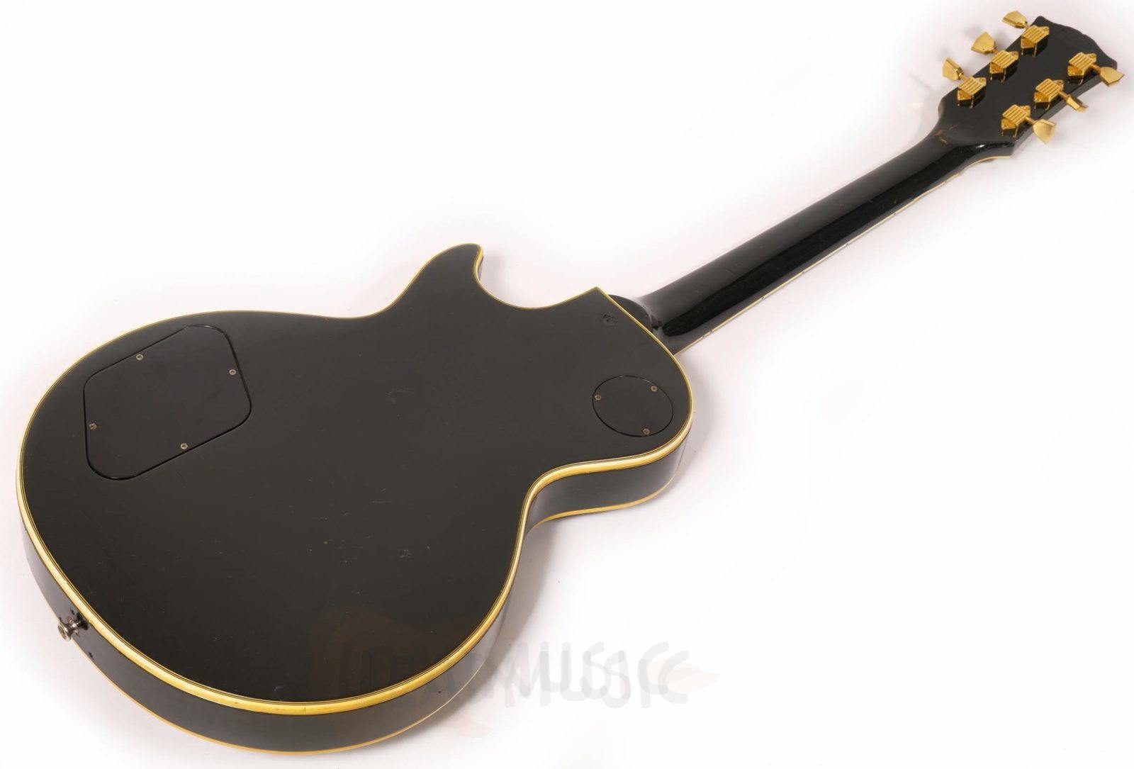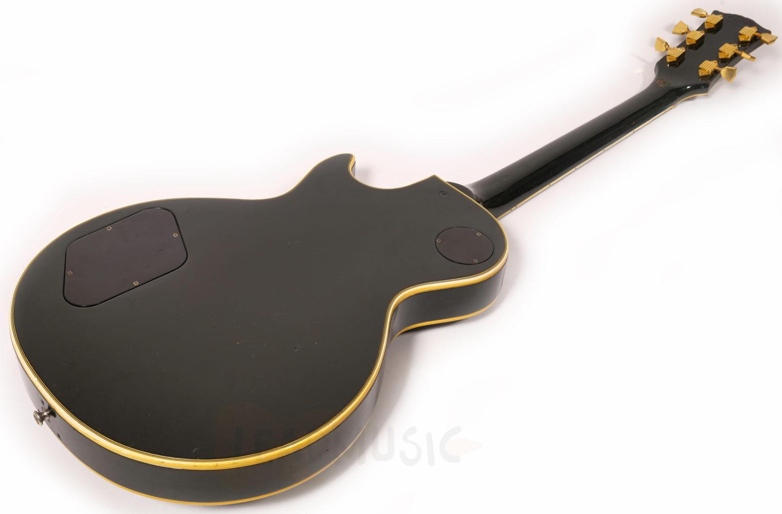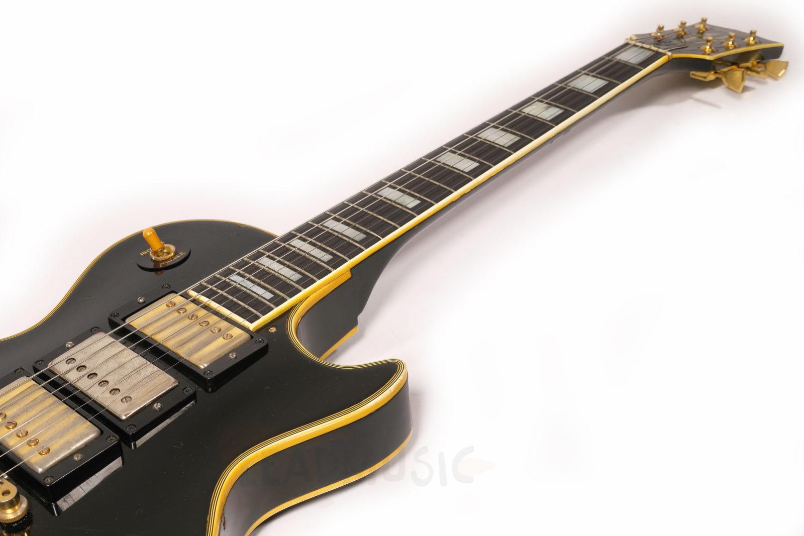 Cette Les Paul Custom date de 1970, possédant des potares avec le code 137 7018(18th week 1970) qu’on ne retrouve plus sur la plupart des Gibson de la fin 1970 et dès 1971. Les micros sont des T-Tops avec Pat.number originaux (la suite des PAF en fait), et les soudures originales ont été touchées sur le potare du micro manche mais pas sur celui du micro aigu. Le manche en acajou 3 pièces est parfait, rond mais pas épais, super confortable, et les frettes, bien que légèrement basses, ne présentent que peu de marque de jeu. Corps acajou, table érable, on reste en terrain connu donc. Il y a eu donc une fracture partielle et réparation sur la tête de manche, mais sans reprise de vernis ni finish. Et évidemment ce micro middle, un Seymour SH4 JB des années 90 a été rajouté et la défonce a été faite de manière amateur. Le pont, stoptail, mécaniques, cadres de micros ne sont pas originaux. Les potares et boutons de potares sont originaux. Il y a eu un Bigsby sur cet instrument, de petits trous restent sur la table et la tranche. Et suite à un vol dans les années 80, le numéro de série a été gratté mais reste en partie lisible. Au niveau du timbre, cet instrument est puissant et résonne déjà beaucoup en acoustique, et délivre un bon niveau de sortie, beaucoup d’attaque et de définition, mais ample une fois branché. C’est assez étonnant vu que l’on a l’habitude dès la décennie 70’s de passer sur les Les Paul un peu comme chat sur braise.