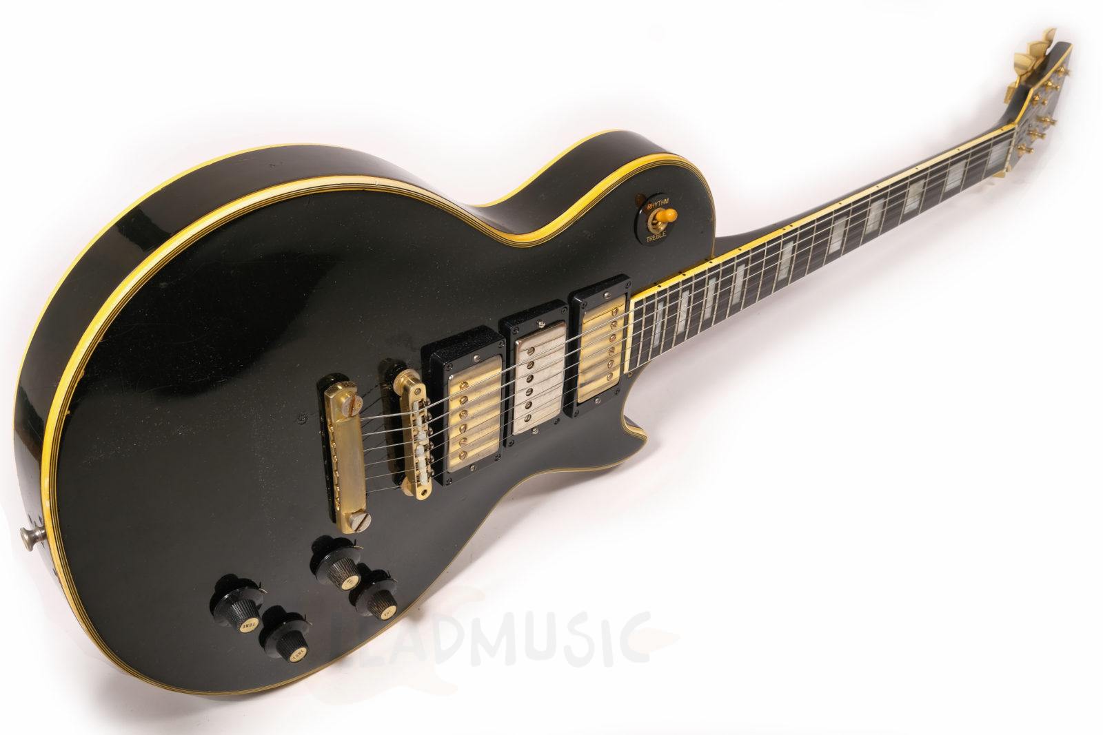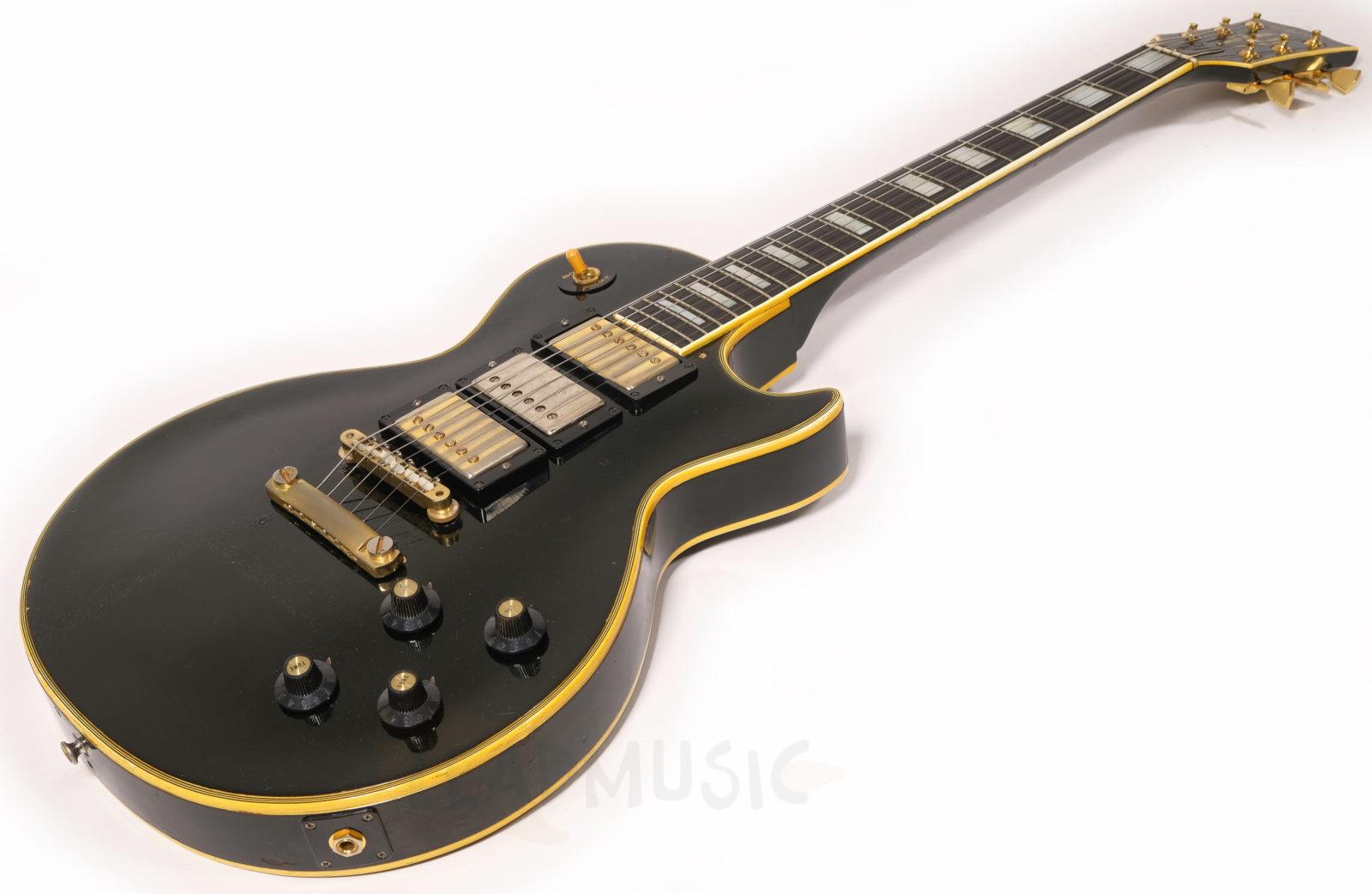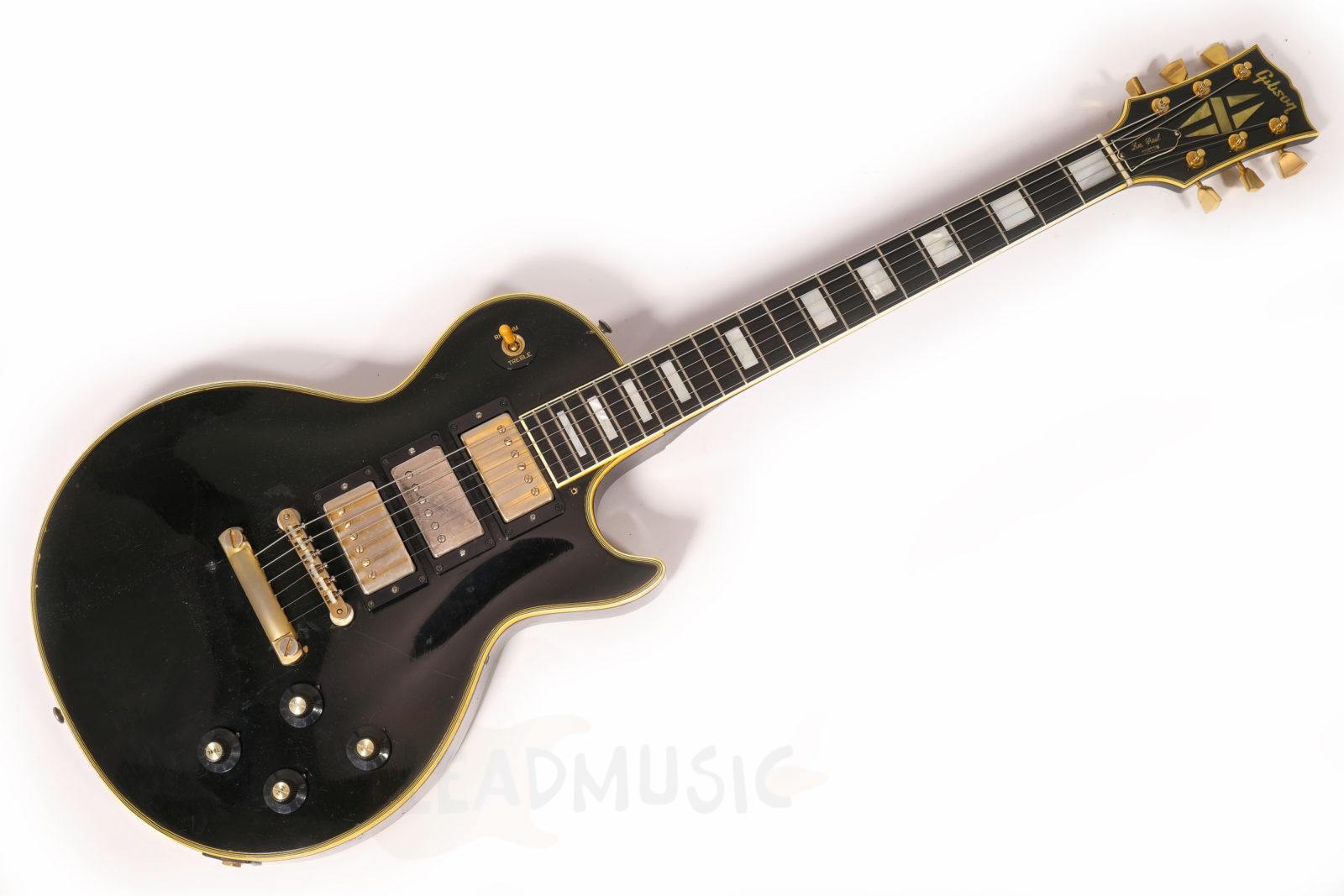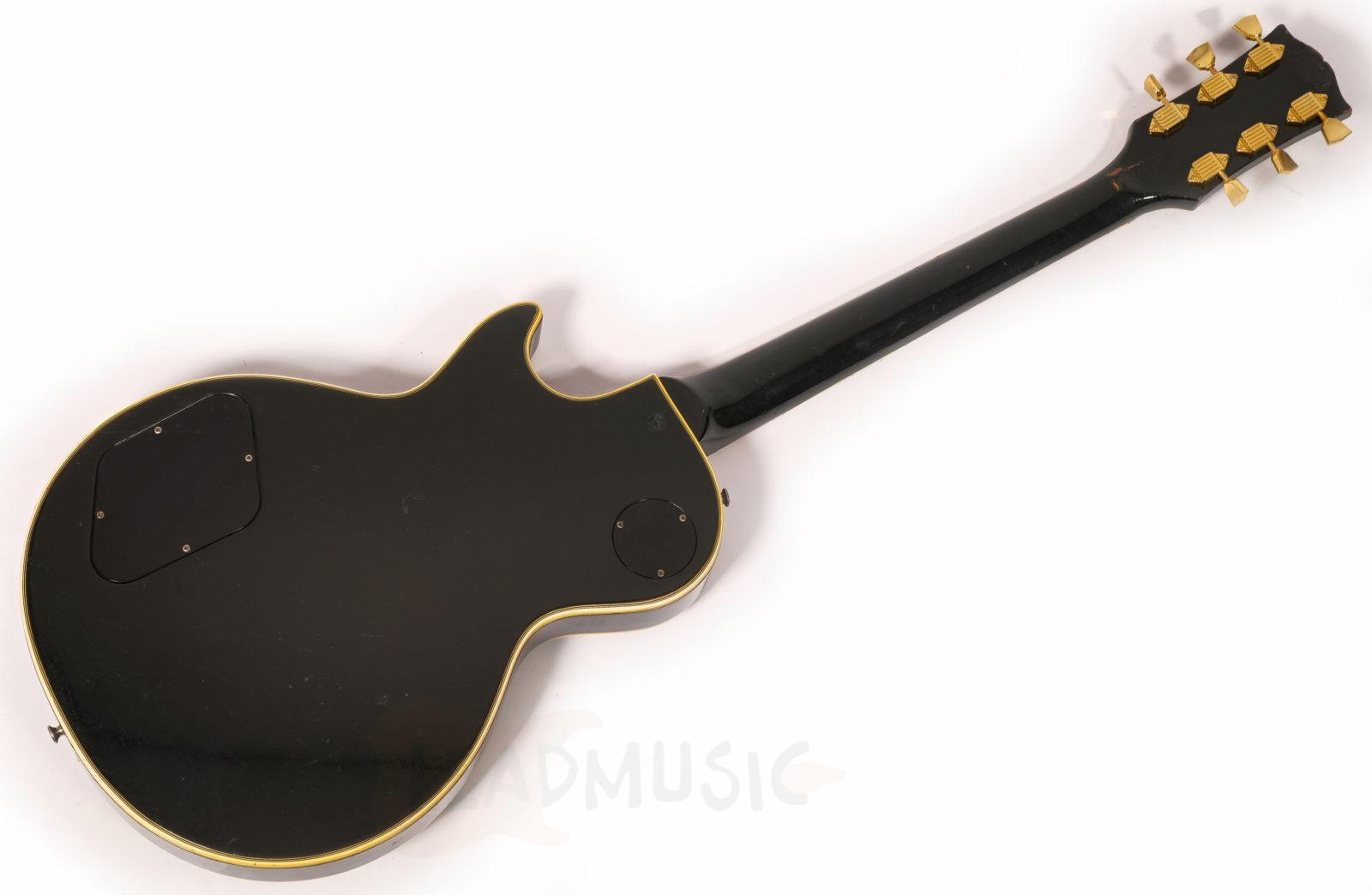 Cette Les Paul Custom date de 1970, possédant des potares avec le code 137 7018(18th week 1970) qu’on ne retrouve plus sur la plupart des Gibson de la fin 1970 et dès 1971. Les micros sont des T-Tops avec Pat.number originaux (la suite des PAF en fait), et les soudures originales ont été touchées sur le potare du micro manche mais pas sur celui du micro aigu. Le manche en acajou 3 pièces est parfait, rond mais pas épais, super confortable, et les frettes, bien que légèrement basses, ne présentent que peu de marque de jeu. Corps acajou, table érable, on reste en terrain connu donc. Il y a eu donc une fracture partielle et réparation sur la tête de manche, mais sans reprise de vernis ni finish. Et évidemment ce micro middle, un Seymour SH4 JB des années 90 a été rajouté et la défonce a été faite de manière amateur. Le pont, stoptail, mécaniques, cadres de micros ne sont pas originaux. Les potares et boutons de potares sont originaux. Il y a eu un Bigsby sur cet instrument, de petits trous restent sur la table et la tranche. Et suite à un vol dans les années 80, le numéro de série a été gratté mais reste en partie lisible. Au niveau du timbre, cet instrument est puissant et résonne déjà beaucoup en acoustique, et délivre un bon niveau de sortie, beaucoup d’attaque et de définition, mais ample une fois branché. C’est assez étonnant vu que l’on a l’habitude dès la décennie 70’s de passer sur les Les Paul un peu comme chat sur braise.