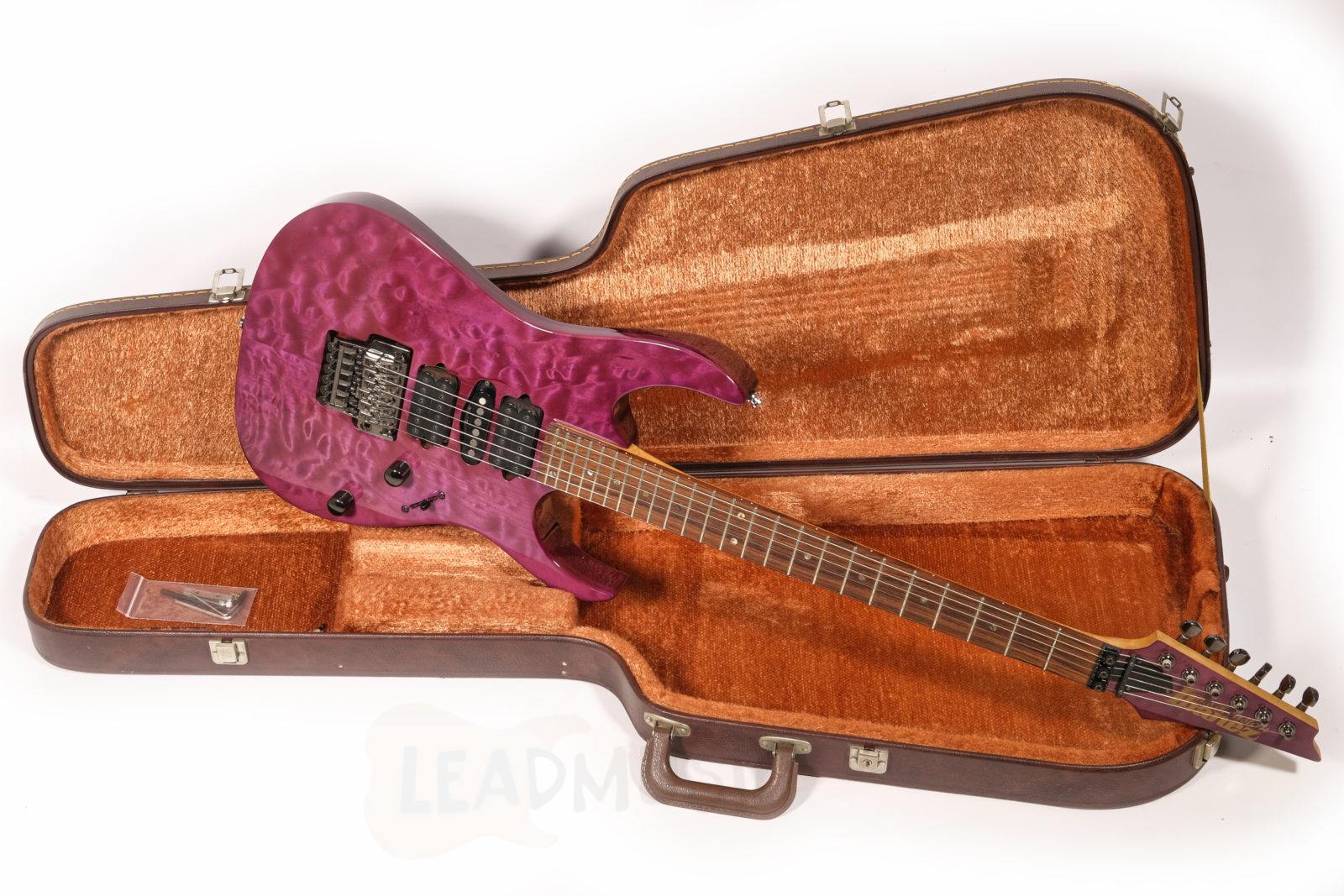 Quelle bombe que voilà, et derrière cet acronyme UCEWQM se cache l’appellation USA Custom Exotic Wood Quilt Maple, et ces guitares sont monstrueuses et rares. Les modèles USA Custom Exotic Wood (UCEW) ont été produits pour Ibanez par Hosono Guitars en Californie. Comme leur nom l’indique, cette série était dotée de tables en bois exotiques. Elles pouvaient être commandées sur mesure via les revendeurs Ibanez, avec de nombreuses options possibles, notamment la configuration des micros, le choix des micros, la tête, le matériau de la touche et ses incrustations, ainsi que l’électronique. Le fondateur et maître luthier de Hosono, Tak Hosono, a ensuite été engagé par Ibanez pour ouvrir leur Custom Shop de Los Angeles.