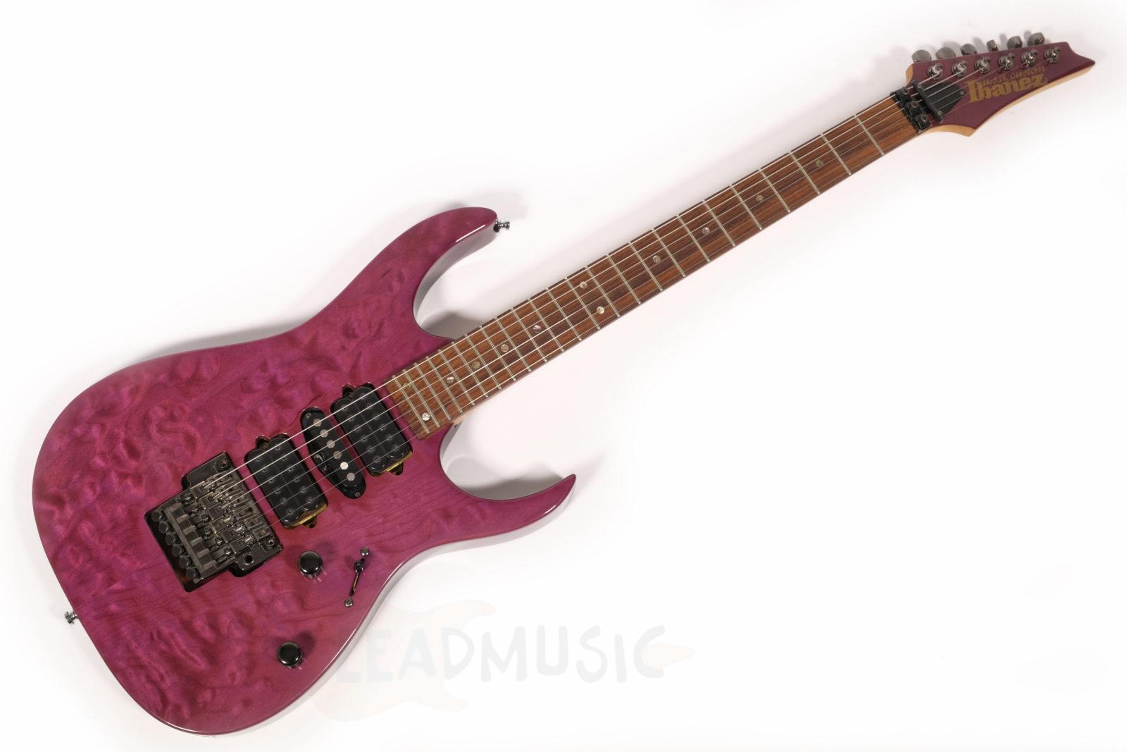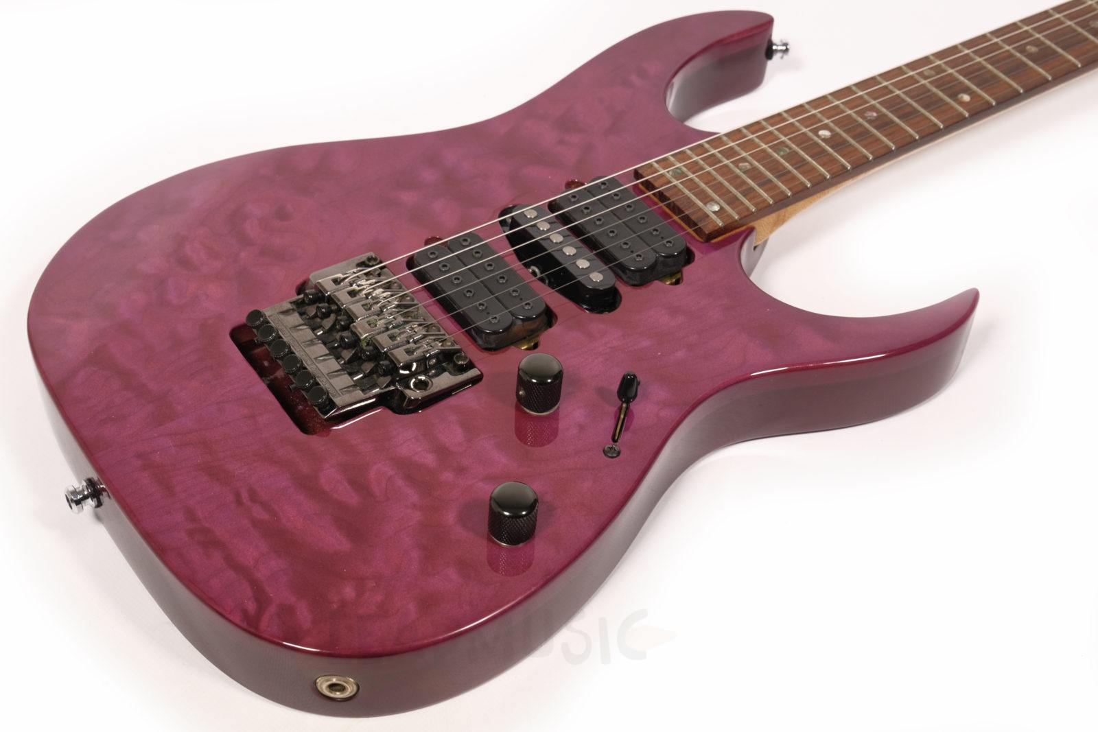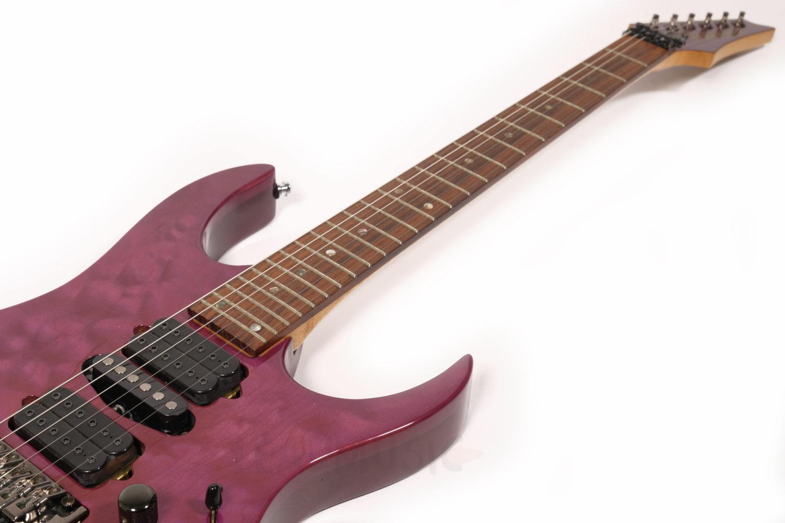 revenons à notre série originale, la UCEW de 1992. Notre RG USA Custom UCEWQM présentée ici se distingue par un corps en aulne avec une superbe table en érable quilté AAA avec finition Purple transparente. L’épaisseur et les motifs de la table sont exceptionnels. Le manche en érable moucheté est lui aussi absolument superbe et est monté avec une touche en palissandre. Le manche est une bombe de confort, et grâce à la touche au radius moderne, les techniques shred et les bends deviennent un véritable jeu d’enfant.