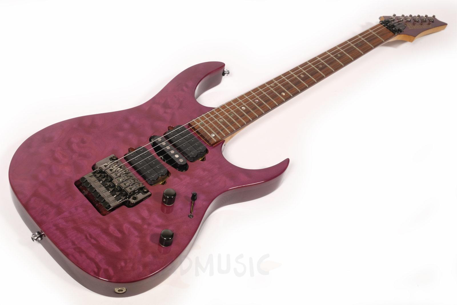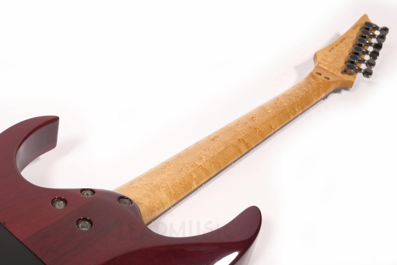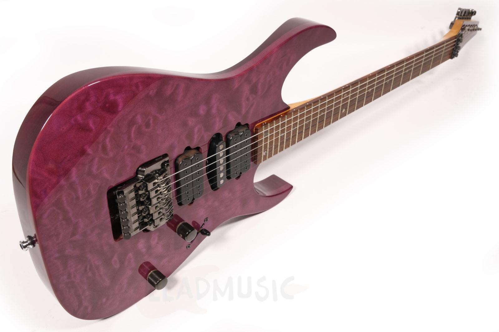 revenons à notre série originale, la UCEW de 1992. Notre RG USA Custom UCEWQM présentée ici se distingue par un corps en aulne avec une superbe table en érable quilté AAA avec finition Purple transparente. L’épaisseur et les motifs de la table sont exceptionnels. Le manche en érable moucheté est lui aussi absolument superbe et est monté avec une touche en palissandre. Le manche est une bombe de confort, et grâce à la touche au radius moderne, les techniques shred et les bends deviennent un véritable jeu d’enfant.