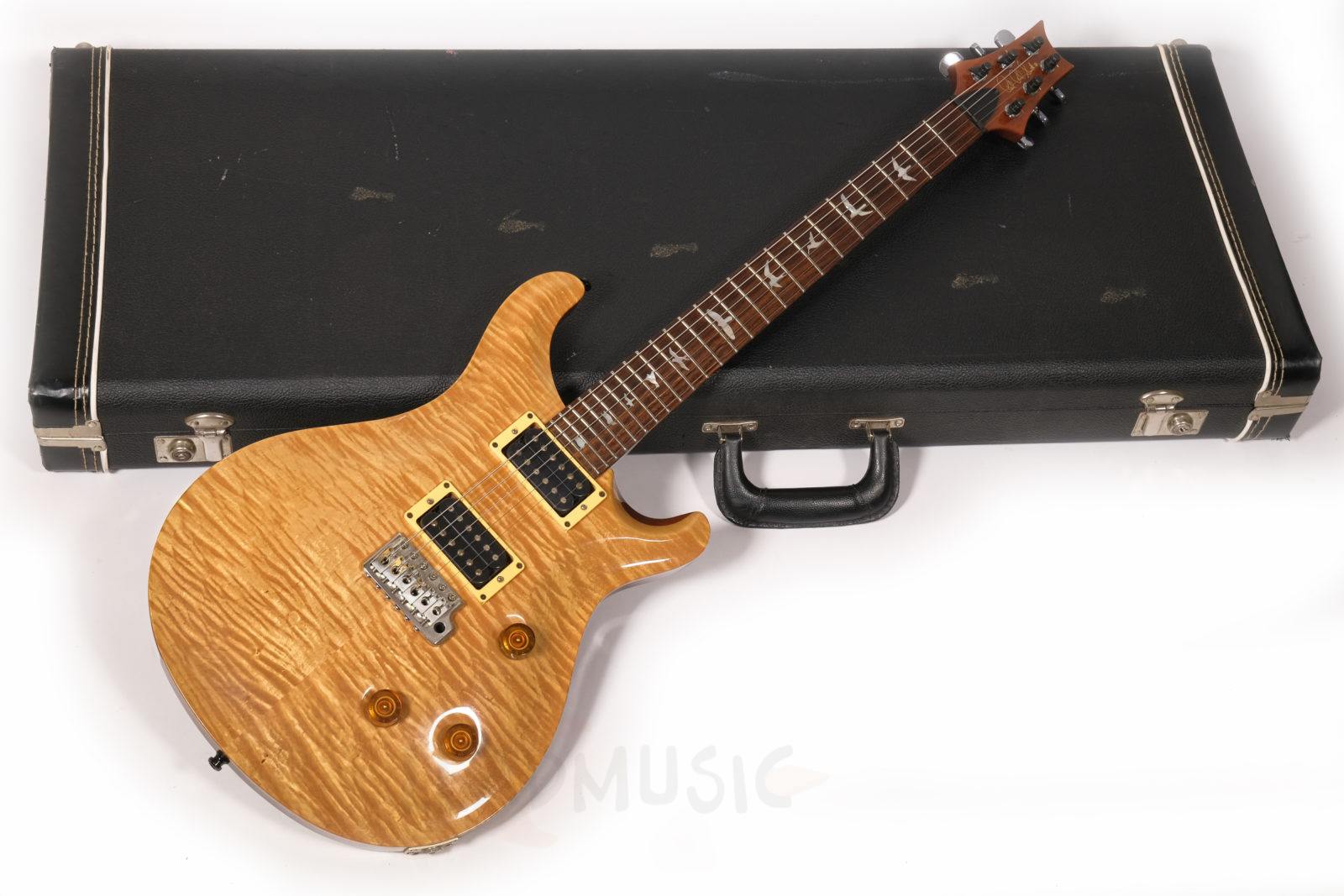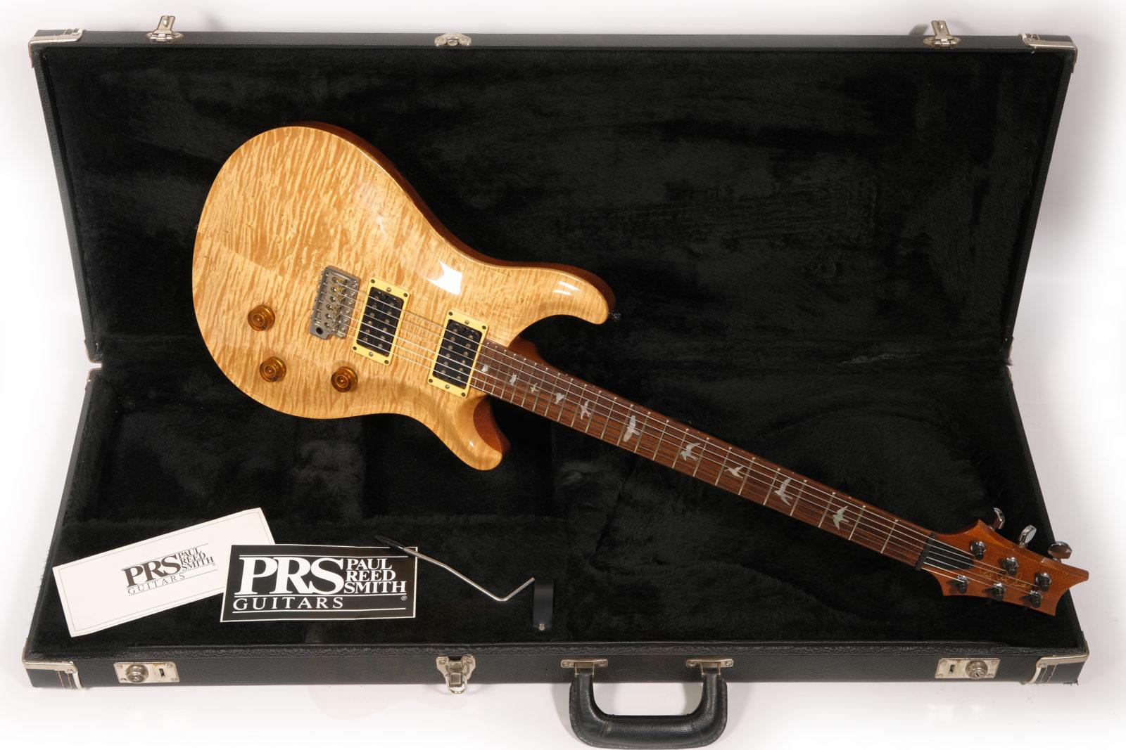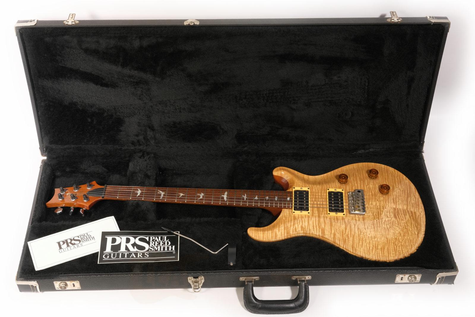 Quelle belle guitare que voilà, avec un finish Natural et un 10Top absolument splendides. On considère plusieurs époques de PRS et plusieurs périodes de manufacture, toutes marquées par des spécifications et particularités, ou généralités. Les PRS originales d’avant 1990 sont rares et recherchées, et évidemment, plus on s’approche de 1985 (sans évidemment parler des pré-production antérieures à 1985) et plus c’est cher. Mais en fait, entre 1990 et le milieu de cette décennie, quasiment seuls la touche en palissandre de Rio et le Sweet Switch avaient été remplacés en 1990. Puis en 1996, PRS déménage, et ce changement d’usine à Stevensville détermine la seconde période de PRS… Voici donc une bombe de 1995, de la première période donc, avec tout ce qu’il faut, le 10 Top, les oiseaux, un finish Natural splendide et évidemment un excellent état général.