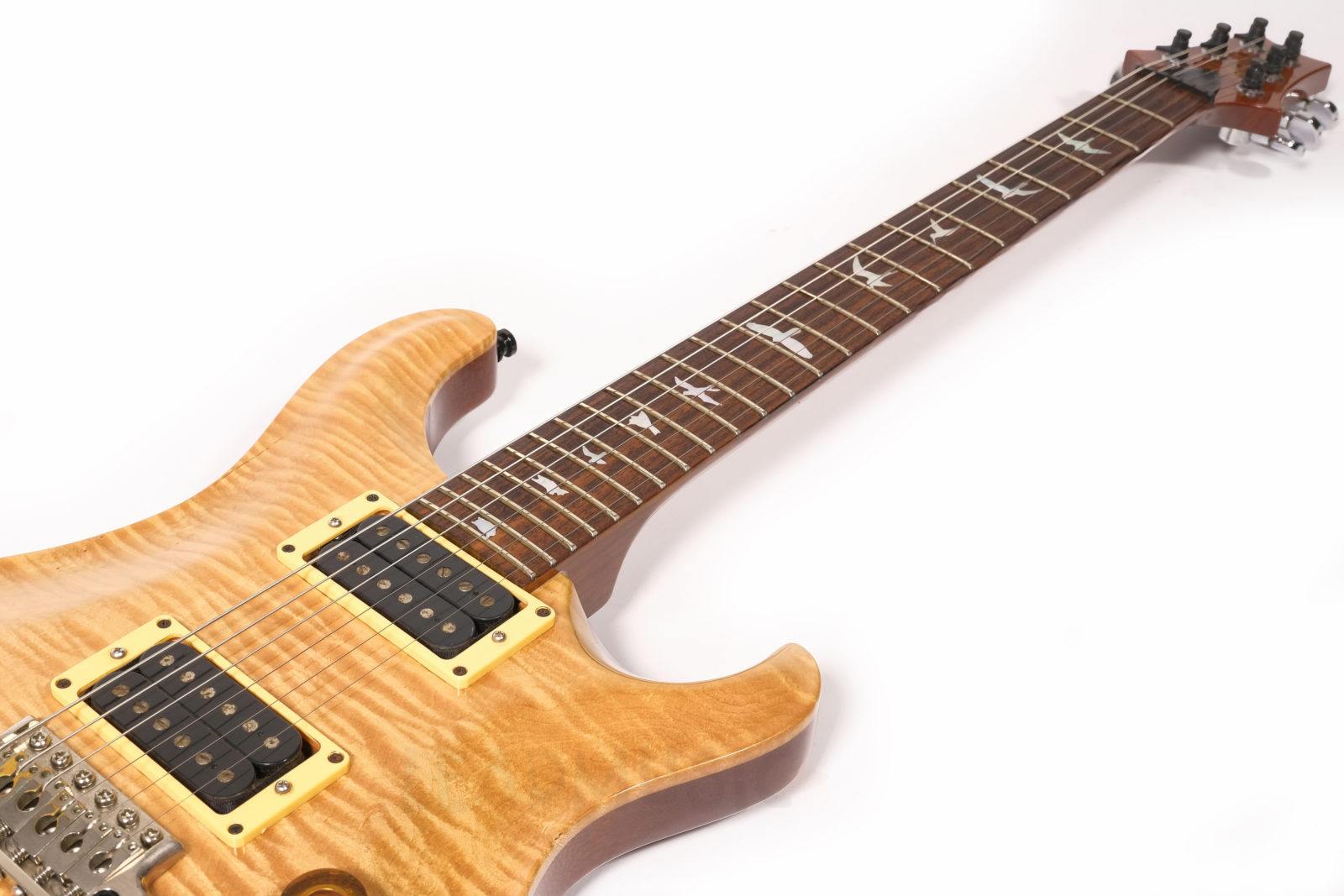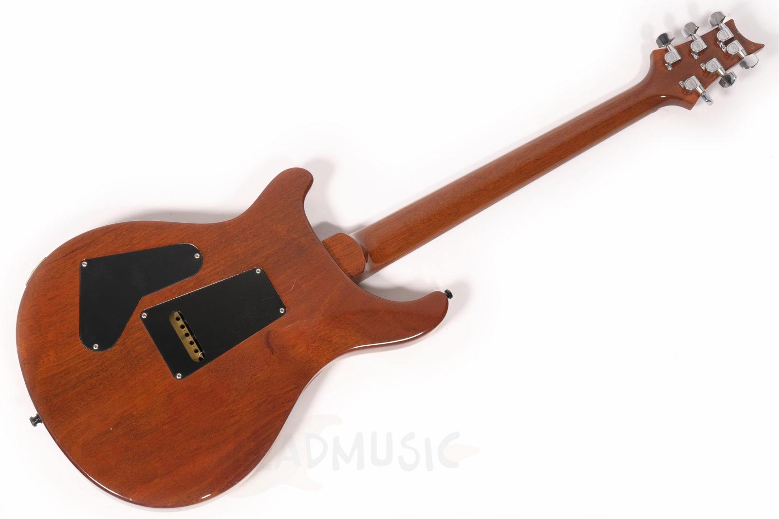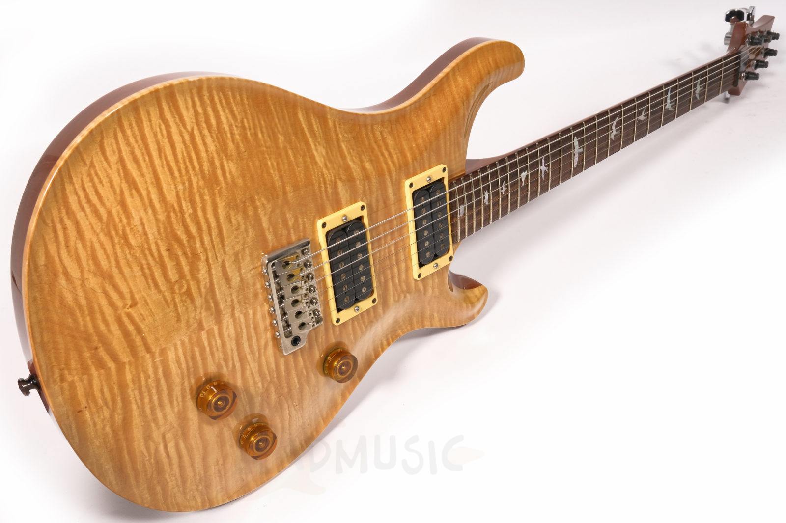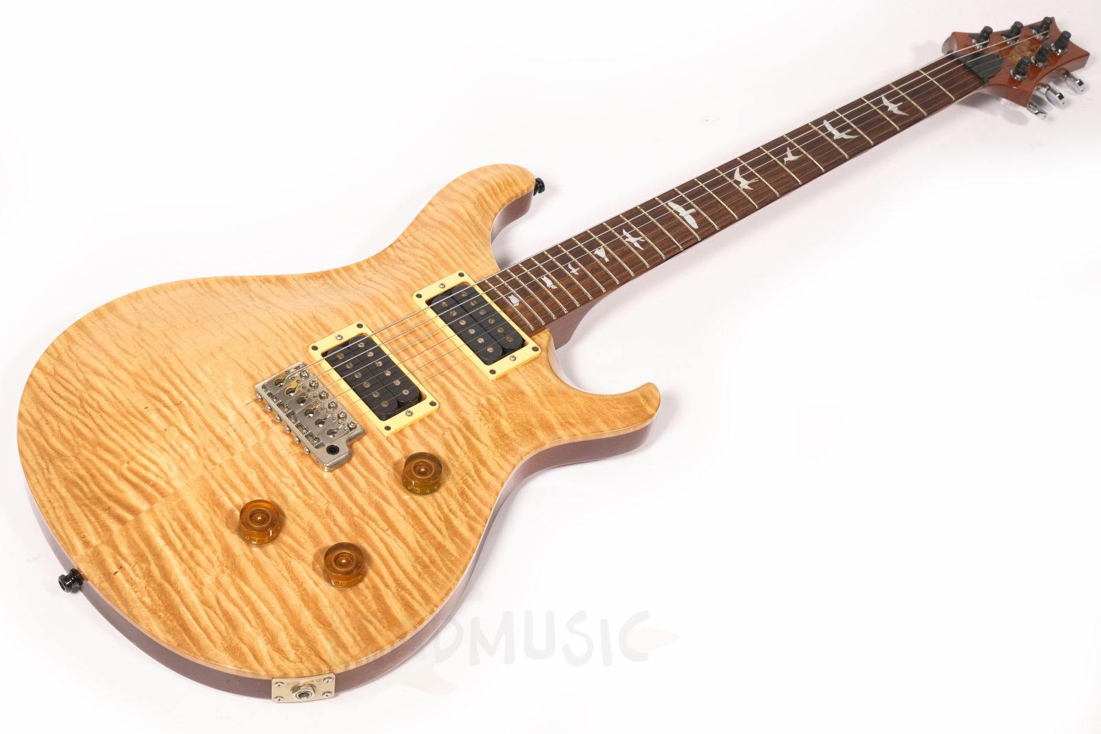 Quelle belle guitare que voilà, avec un finish Natural et un 10Top absolument splendides. On considère plusieurs époques de PRS et plusieurs périodes de manufacture, toutes marquées par des spécifications et particularités, ou généralités. Les PRS originales d’avant 1990 sont rares et recherchées, et évidemment, plus on s’approche de 1985 (sans évidemment parler des pré-production antérieures à 1985) et plus c’est cher. Mais en fait, entre 1990 et le milieu de cette décennie, quasiment seuls la touche en palissandre de Rio et le Sweet Switch avaient été remplacés en 1990. Puis en 1996, PRS déménage, et ce changement d’usine à Stevensville détermine la seconde période de PRS… Voici donc une bombe de 1995, de la première période donc, avec tout ce qu’il faut, le 10 Top, les oiseaux, un finish Natural splendide et évidemment un excellent état général.