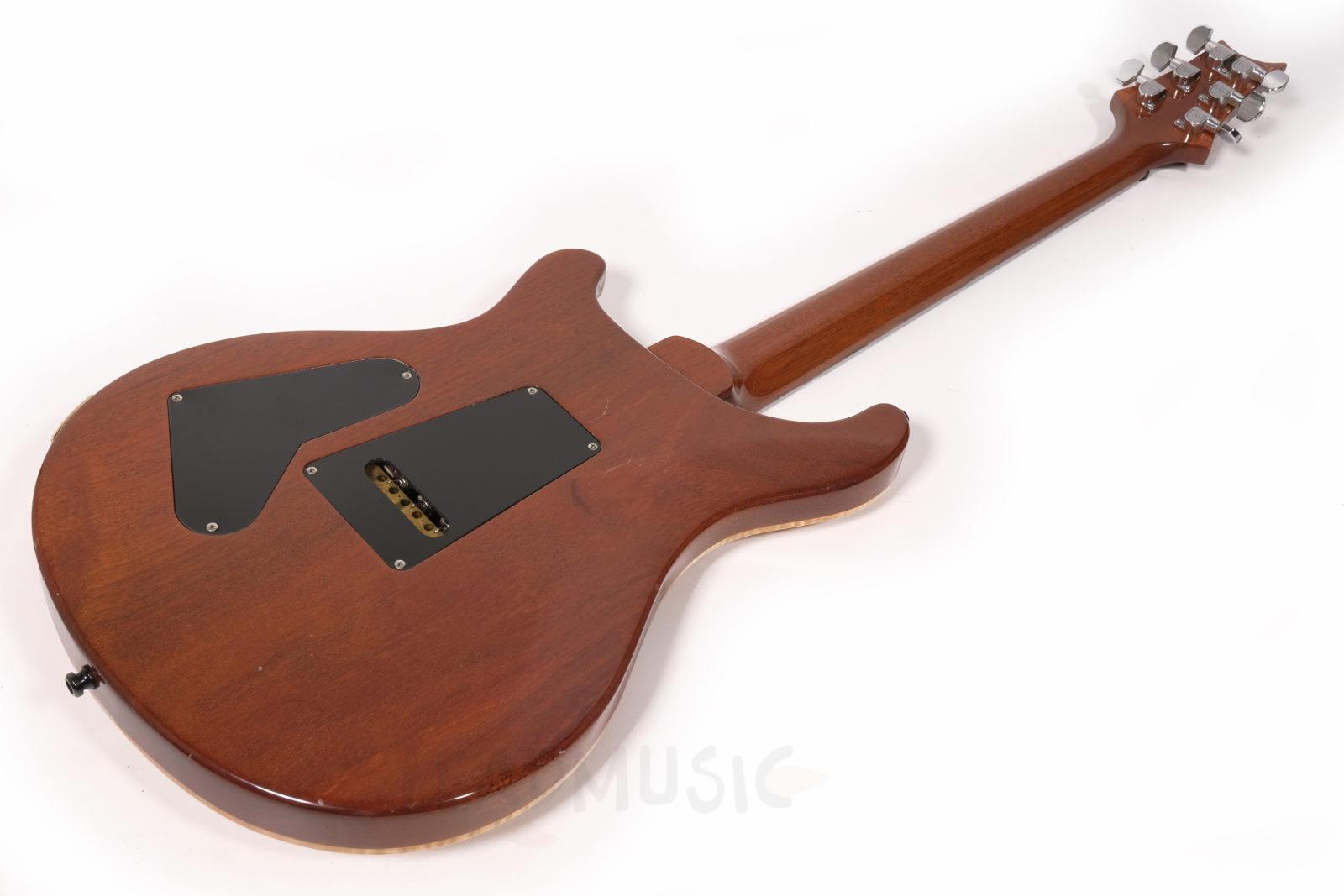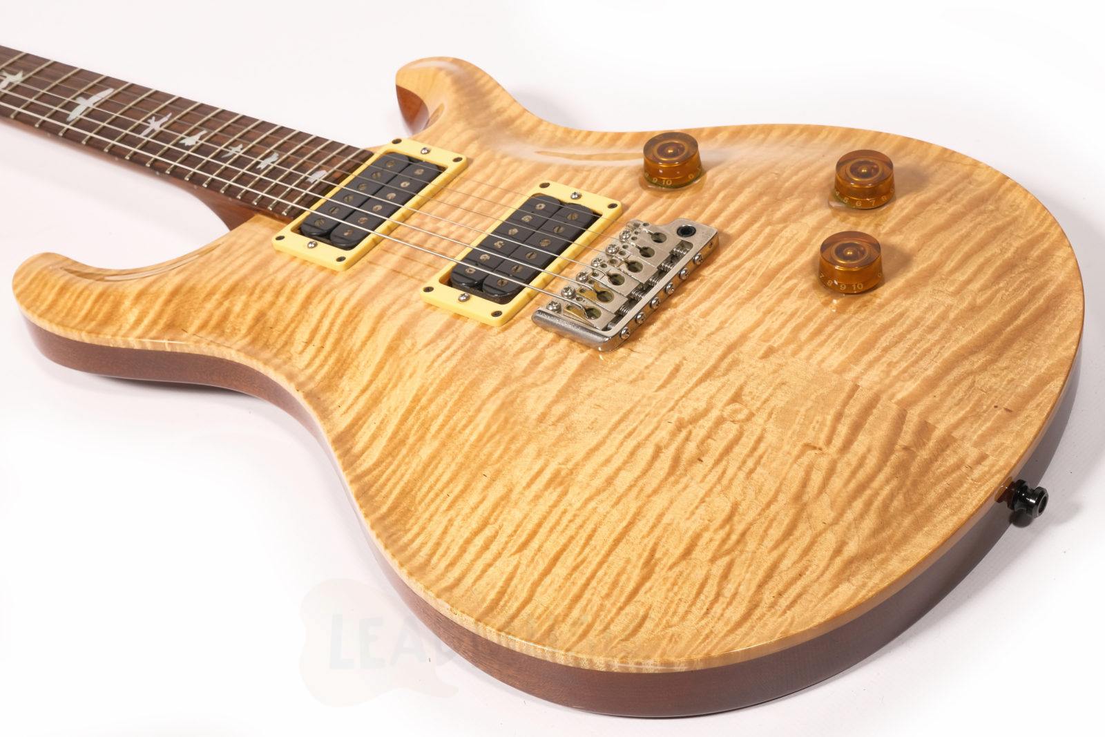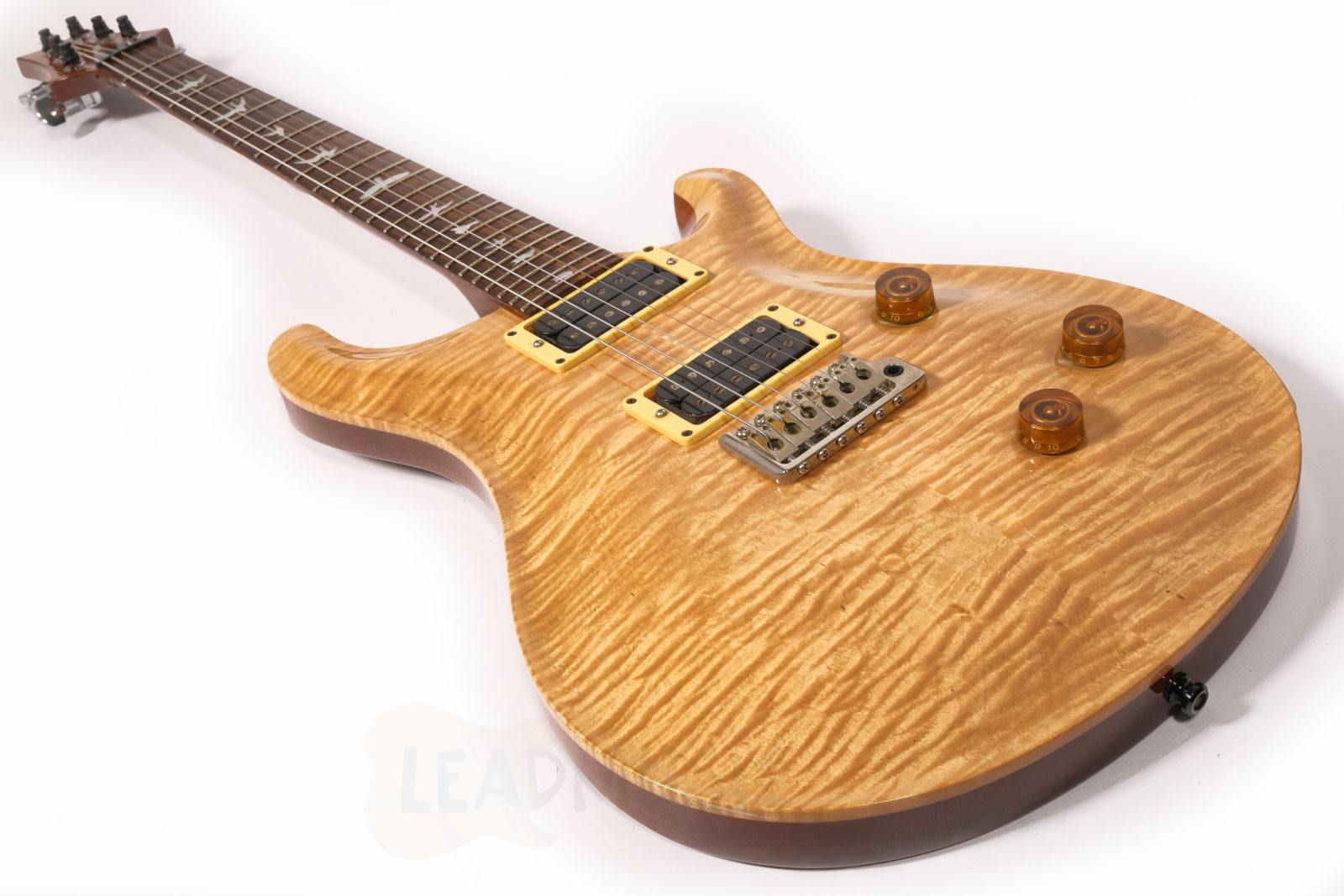 Cette guitare est légère et possède un manche hyper agréable et confortable. Profil unique typique de cette époque. Montée avec les micros Bass & Treble habituels de cette époque, cette Custom 24 possède l’électronique des modèles de production depuis 1990. Niveau timbre et jouabilité, c’est un paradis. L’instrument est léger, résonnant et possède l’attaque et la définition des Custom 24. On passe allégrement dans tous les registres, du Metal au Rock en passant par des timbres plus blues ou jazzy… Bref, ça fait tout une Custom 24 en général… La table, en 10Top optionnel, est absolument splendide, avec de belles veines et des motifs très prononcés, et la teinte Natural ayant pris une teinte très légèrement ambrée avec le temps, révèle les flammes de superbe manière.