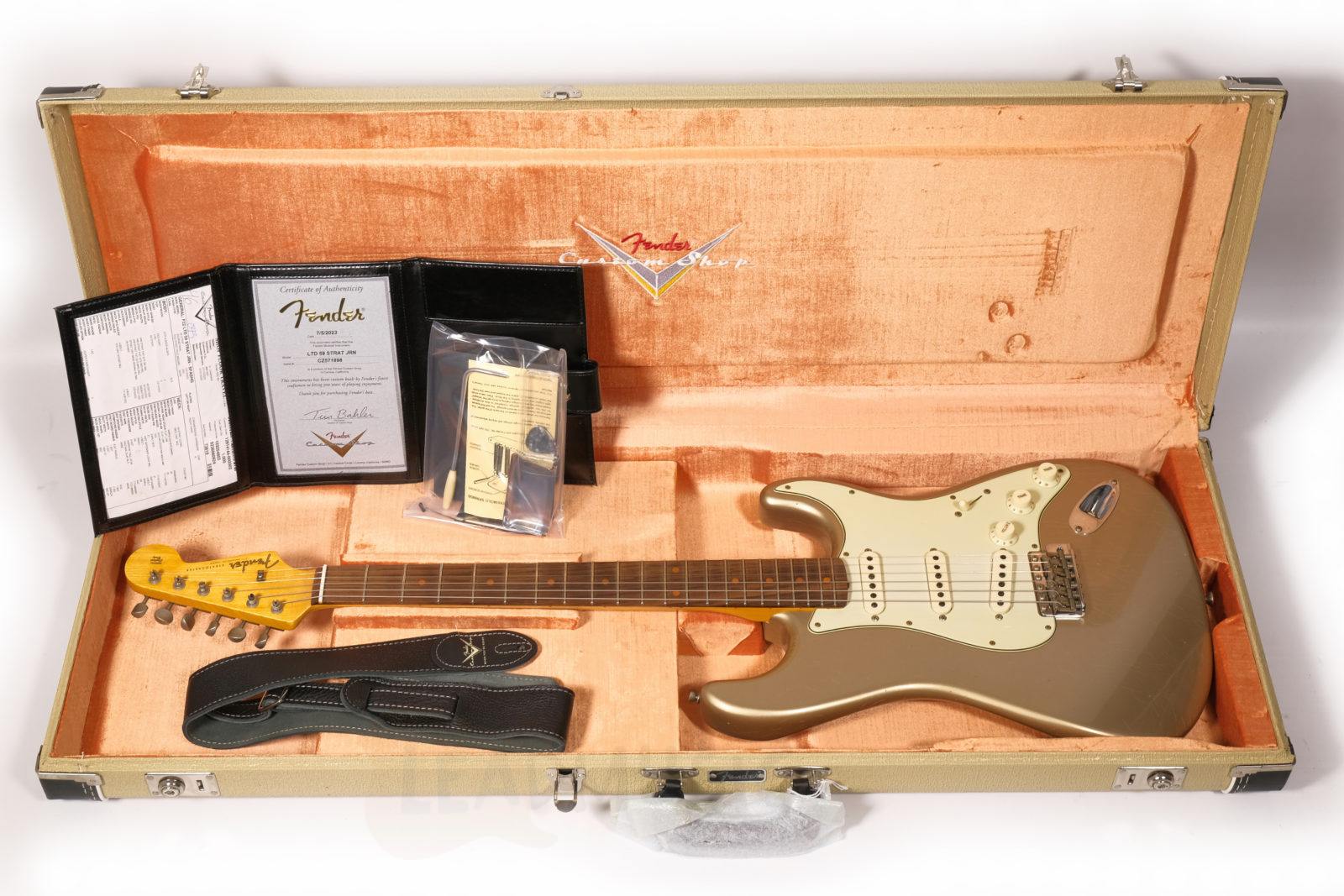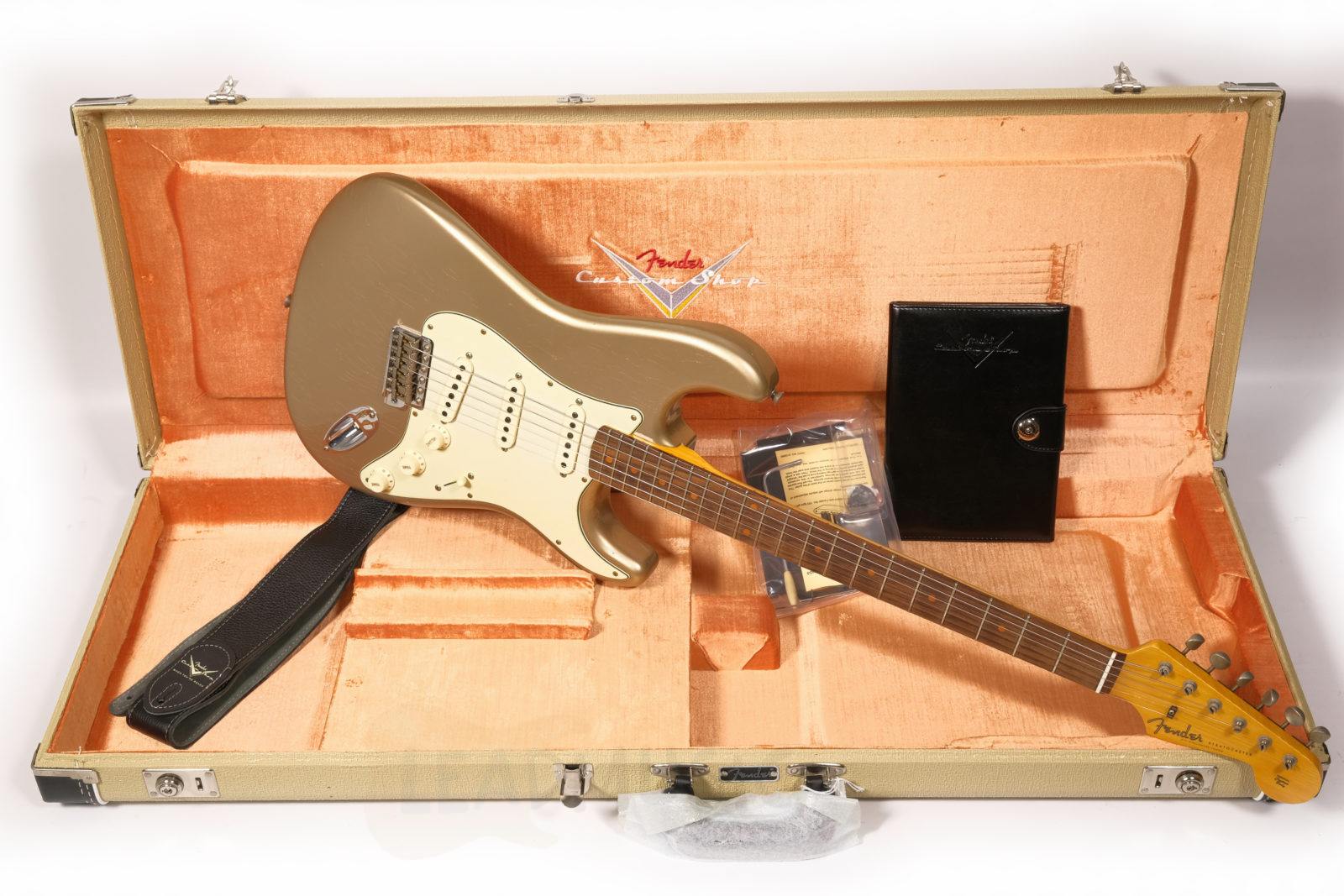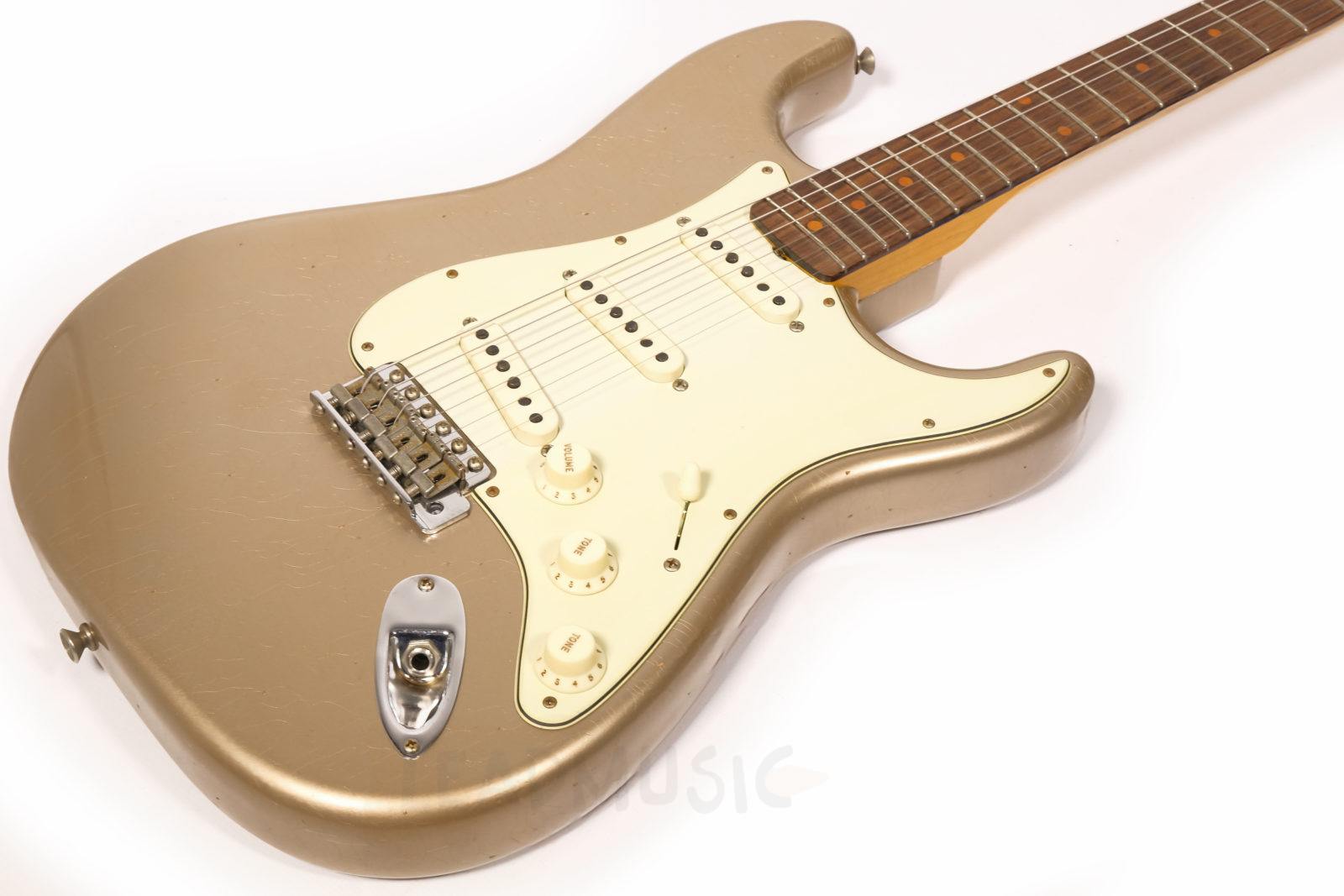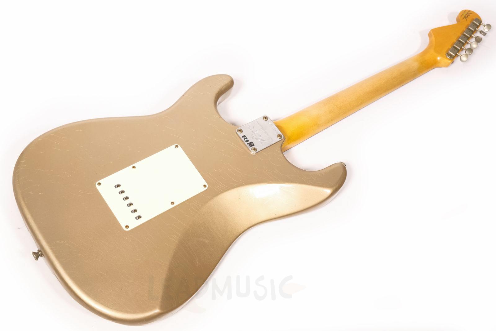La guitare est construite avec un vernis Super Faded Aged Shoreline Gold sur un corps en aulne sélectionné et associé à un manche en érable Riftsawn! La guitare a des micros Fender Custom Shop Handwound Texas Special™ Single-Coil Strat. Le manche a un profil super confortable, le 60’s Oval C, et un radius de 9.5″ et des frettes narrow tall 6105 qui finissent de rendre ce bébé super confortable. Niveau son, les Handwound Strat dépotent et la belle se fera un plaisir de vous en procurer.